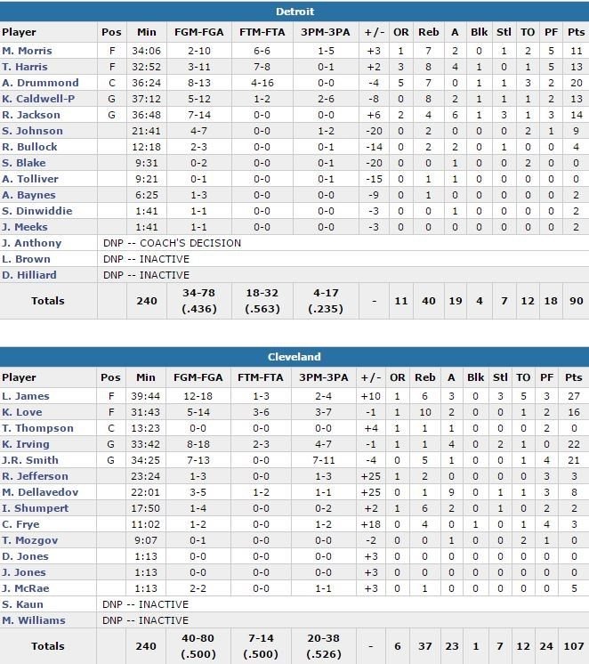 À noter : les Pistons ont shooté à 4/17 à 3-points et 43.6% sur le match. Cleveland (7/14 aux lancers-francs dont un 1/3 pour James) a terminé de son côté à pile 50% de réussite. Kevin Love est en double-double avec 16 points à 5/14 et 10 rebonds et contribue à la réussite lointaine des siens avec un 3/7 à 3-points.