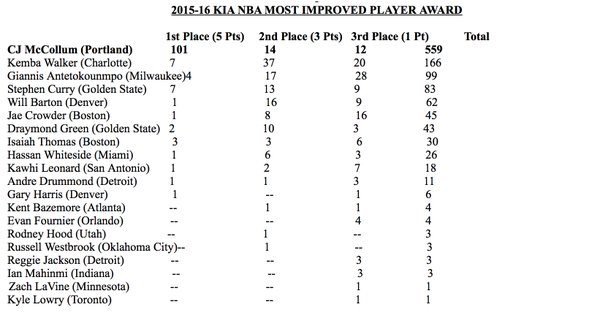 Sans trop de surprise c’est l’arrière des Blazers CJ McCollum qui décroche le titre de meilleure progression de l’année largement devant Kemba Walker et Giannis Antetokounmpo. Il obtient 101 des 130 premières places. A noter que Stephen Curry est lui au pied du podium avec 7 premières places. Draymond Green et Kawhi Leonard ont aussi reçu pas mal de votes.