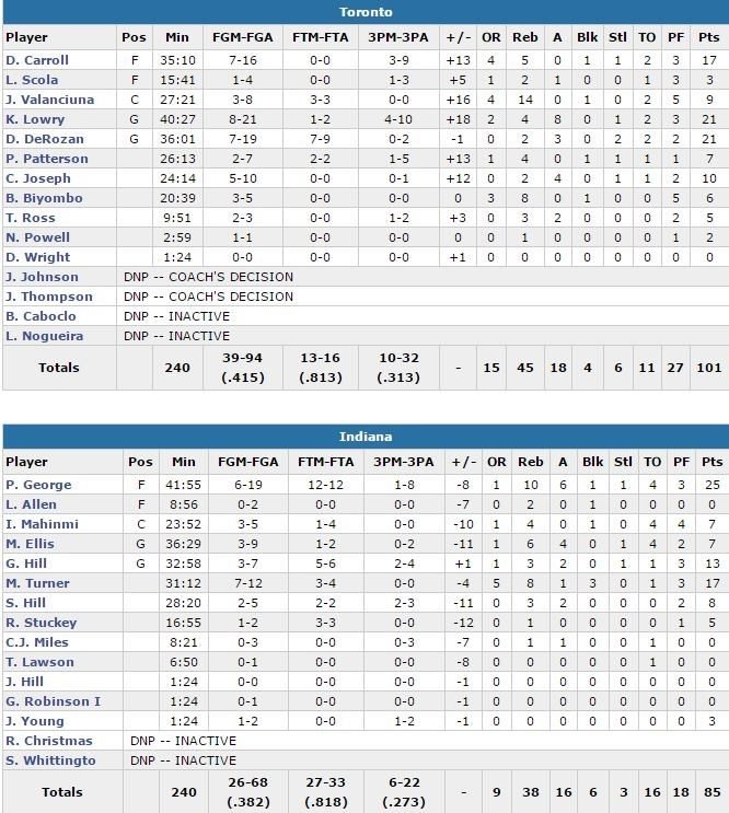 DeMarre Carroll ajoute 17 points à 7/16 et 5 rebonds et Jonas Valanciunas 9 points à 3/8 et 14 rebonds. Paul George réalise un match complet (25 points à 6/19, 10 rebonds et 6 passes) assisté de son rookie Myles Turner (17 points à 7/12, 8 rebonds et 3 contres) mais dès les premières minutes, Toronto (11 ballons perdus à 16) donne le ton. DeRozan lance un 13-4 en faveur des siens dans le 1er quart et Toronto prend rapidement l’avantage – sans plus jamais le lâcher – 21-13.