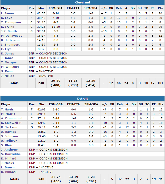 Les Cavaliers ont été menés par leur big three, même si LeBron James a été quelque peu maladroit. Il termine avec 20 points à 8/24, 13 rebonds et 7 passes mais ses acolytes Kyrie Irving (26 points à 11/20 dont 3/6 à trois points) et Kevin Love -20 points à 7/10 et 12 rebonds) avaient mieux réglé la mire. Irving rentre notamment deux gros trois points en fin de rencontre. Les Cavaliers shootent à 48.8% avec un excellent 12/29 derrière l’arc et seulement 10 ballons perdus. Si Detroit shoote à 48.6%, l’équipe paye son petit 6/23 derrière l’arc et la domination de Cleveland au rebond (46-32). Les 5 titulaires atteignent les 10 points avec 18 unités pour Kentavious Caldwell-Pope, 17 pour Andre Drummond, 16 pour Marcus Morris et 13 pour Tobias Harris et Reggie Jackson.