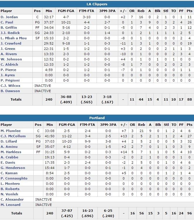 Les Clippers, qui avaient limité leurs adversaires à 88 points en moyenne sur les 2 premiers matchs (Portland tournait à 105.1 points par match en saison régulière), sont menés par les 26 points de Chris Paul (10/21, 3 rebonds et 9 passes, 4ème match d’affilée à 25 points en playoffs depuis l’année dernière) mais n’ont pas pu compter sur de grosses performances de la part de Blake Griffin (12 points à 5/16, 7 rebonds et 4 passes) ou J.J. Redick (5 points à 2/10, toujours gêné par un talon douloureux). Le 6ème homme de l’année Jamal Crawford comble les trous avec 19 points à 9/18 mais cela restera insuffisant. DeAndre Jordan est lui en double-double avec 11 points à 4/7 et 16 rebonds mais ses lancers-francs viennent pourrir sa ligne de stats (3/10).