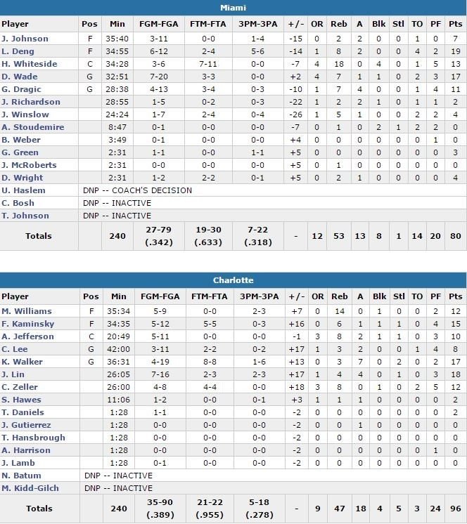 Kemba Walker ajoute 17 points (4/19, 3 rebonds et 7 passes) et Marvin Williams, invisible sur les 2 premiers matchs (1/17), signe 12 points à 5/9 et 14 rebonds. Luol Deng mène le Heat avec 19 points (6/12, 8 rebonds et 2 passes) dont 5 trois-points, Dwyane Wade suit avec 17 points (7/20, 7 rebonds) et Hassan Whiteside, qui s’est battu avec les fautes (5), termine à 13 points (3/6 et 7/11 aux lancers-francs) et 18 rebonds. Le Heat, qui avait shooté à 58% de moyenne sur les 2 premières rencontres, a cette fois été tenu à seulement 34%. Les Hornets n’ont pas été beaucoup plus adroits avec 38.9% de réussite.