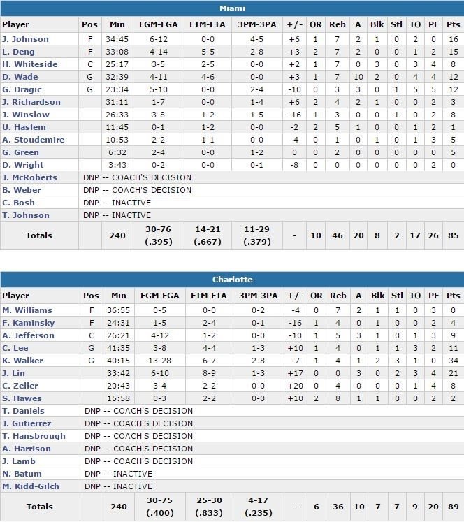 Lee a également contribué à limiter Dwyane Wade à 12 points à 4/11 (mais 10 passes). Aucun joueur du Heat ne dépasse les 16 points (Joe Johnson meilleur marqueur avec 16 points à 6/12, 7 rebonds et 2 passes). Hassan Whiteside termine à 8 points à 3/5, 7 rebonds et 2 contres en 25 minutes et pour le 2ème match consécutif, les Hornets ont dominé dans la peinture avec un avantage 44-30. Menés 26-19 après un quart-temps, les Hornets (40%aux tirs) passent ensuite un 23-6 à leurs adversaires (11 points de Lin) et prennent 9 points d’avance à la mi-temps après avoir tenu Miami (39.5% de réussite) à 13 points dans le 2ème, 48-39.