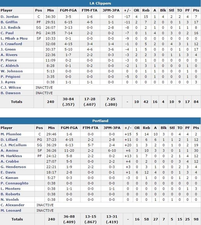 Superbe performance à domicile de Portland cette nuit. Les Blazers ont fait briller tout le monde (27 passes) pour égaliser à 2-2 dans leur série face aux Clippers avec une 2ème victoire d’affilée au Moda Center à la clé, 98-84. Al-Farouq Aminu termine meilleur marqueur des locaux avec 30 points à 11/20, 10 rebonds, 3 passes et 3 contres, C.J. McCollum suit avec 19 points à 6/13, 3 rebonds et 2 passes, Mason Plumlee 2 points à 1/6 mais 14 rebonds, 10 passes et 3 contres alors que la star de l’équipe, Damian Lillard, se contente de 12 points à 4/15, 6 rebonds et 6 passes. Mo Harkless et Allen Crabbe ajoutent 12 points chacun.