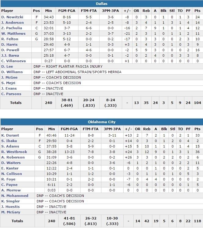 Dirk Nowitzki porte les Mavericks avec 24 points à 8/16 et 5 de ses coéquipiers passent la barre des 10 points, dont Dwight Powell avec 16 points à 6/7, 9 rebonds et 3 passes en 27 minutes. Oklahoma City (3ème victoire consécutive après une défaite 85-84 dans le match 2) a shooté à 50.6% (contre 46.9 pour les visiteurs) et dominé le rebond 42-35 dans ce match. Westbrook marque 13 points dans le 1er quart et permet au Thunder de bien se lancer, 35-24. Les Mavs (privés de David Lee et Salah Mejri, blessés) reviennent à 57-55 dans le 2ème quart-temps mais OKC termine la 2ème mi-temps en force et mène 68-61 à la pause, dans le sillage des 20 points de Durant. Nowitzki (17 points) et Zaza Pachulia (12 points, 5 rebonds et 7 passes) permettent à Dallas de rester en vie en 1ère mi-temps mais cela ne durera qu’un temps.