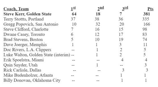 La NBA a élu Steve Kerr coach de la saison, ce qui n’est pas vraiment une surprise puisque les Golden State Warriors ont battu le record de victoires avec 73. Toutefois Luke Walton a été à la tête de l’équipe pendant les 43 premiers matchs (39 victoires et 4 défaites contre 33 victoires et 5 défaites à Kerr) de la saison mais officiellement aucune victoire ne lui revient. Certains pensaient à un titre partagé par les deux mais ce ne sera pas le cas. Il devance Terry Stotts et Gregg Popovich.