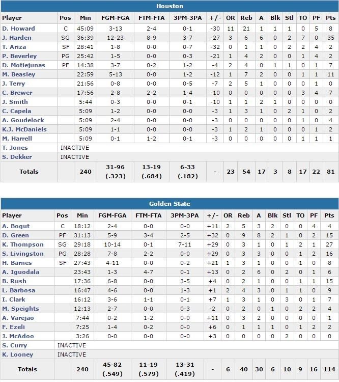 Thompson est devenu le premier joueur de l’histoire de la NBA à rentrer au moins 7 shoots à 3-points sur deux matchs de playoffs consécutifs. Shaun Livingston a lui fait le boulot à la mène en l’absence du MVP avec 16 points à 7/8, 3 rebonds et 3 passes. James Harden signe 25 des 37 points de son équipe en 1ère mi-temps et termine à 35 points (12/23, 6 rebonds et 6 passes) mais les Rockets n’avaient aucune chance de s’en sortir en tentant la stratégie du one-man show. Dwight Howard fait une énorme moisson au rebond mais son apport offensif a été plus que limité (8 points à 3/13 et 21 rebonds).