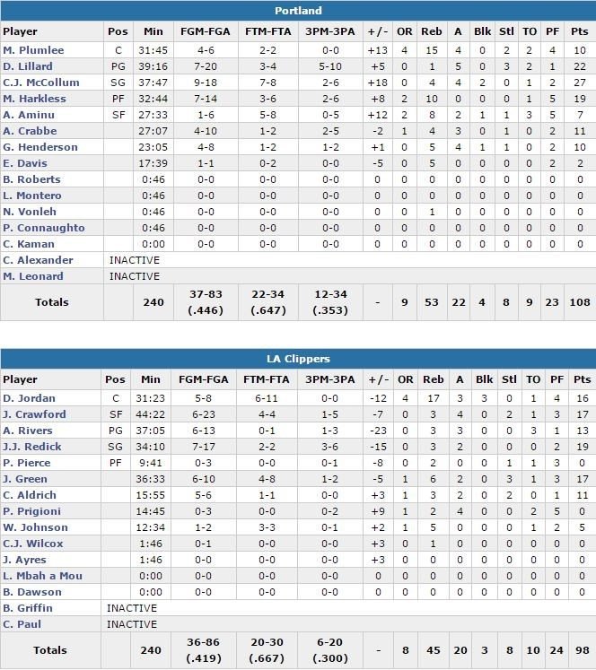 À noter : les Blazers ont compté 6 joueurs à minimum 10 points dans ce match. Ils ont dominé le rebond 53-45. Paul Pierce, titulaire à la place de Griffin, n’a pas marqué en 9 minutes de jeu (0/3).