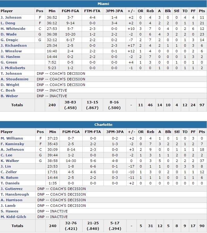 Miami shoote à 60% en 1ère mi-temps et mène de 9 points, 59-50, à la pause. Deng et Wade combinent pour 29 points à 13/19 sur ses deux premiers quarts et le Heat domine également au rebond avec un avantage 23-11 (et 46-31 sur le match). Au retour des vestiaires, Charlotte sort les barbelés et limite le Floridiens à seulement 16 points pour revenir à 5 points, 75-70. Walker ramène les siens à 4 points 85-81 sur un 3-points dans le 4ème puis provoque la 6ème faute de Whiteside à 3 minutes de la fin sur un and one. Il enchaîne ensuite sur un step back à 2’12 pour revenir à 4 points, 90-86. Le meneur aura une chance d’égaliser à environ une minute de la fin mais son pull-up passe à côté. Wade lui, saisit sa chance, avec un 3-points sur l’aile gauche puis un turnaround sur la tête de Courtney Lee pour sceller la victoire.