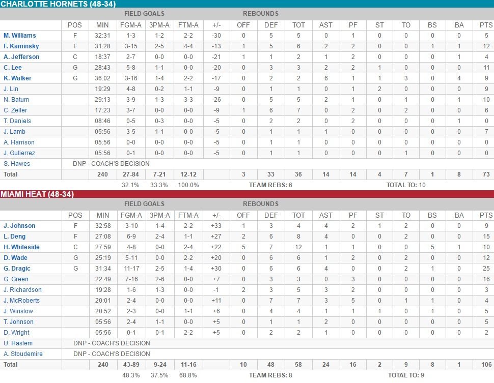 Les Hornets ont été maladroits en début de rencontre (4 points seulement en 5 minutes), ce qui a permis au Heat de s’installer aux commandes sous l’impulsion de Deng, Wade et Witheside, 10-4 puis 17-13. Après s’être réveillés pendant 2 minutes, les Hornets ont très mal fini la première mi-temps, dépassés par le 5 small ball du Heat avec un excellent Goran Dragic à la baguette. Ce dernier a initié un 10-2 qui a propulsé les Floridiens en tête 29-18 après 12 minutes.