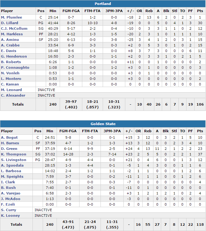 En face les Blazers ont eu du mal en attaque, la faute à la soirée très compliquée du duo Damian Lillard (30 points à 8/26 mais la plupart en fin de match) – CJ McCollum (12 points à 5/17). Mason Plumlee a lui aussi eu du mal avec 1 point à 0/7, 13 rebonds et 6 passes. Portland shoote à seulement 40.2% et prend 15 rebonds de moins.