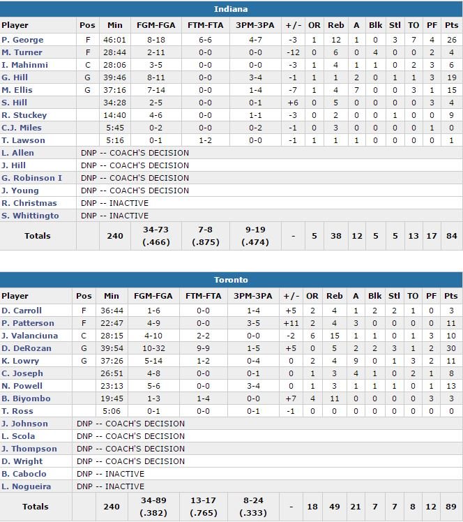Les Raptor (38.2% aux tirs contre 46.6% pour Indiana) s n’avaient plus remporté de série de playoffs depuis 2001 et une victoire en 5 matchs contre lse Knicks. Norman Powell ajoute 13 points, Kyle Lowry 11 points et 9 passes et Patrick Patterson 11 points dans ce premier succès en 7 matchs de l’histoire de la franchise canadienne. Soutenu par leur public de l’air Canada Centre, les hommes de Dwane Casey, porté par 13 points de DeRozan (soit un plus gros total de points que lors de ses matchs 4 et 6, dans lesquels il avait terminé à seulement 8 points), mènent 28-23 après un quart-temps.