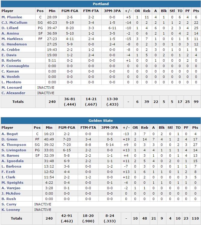 Klay Thompson termine meilleur marqueur de la rencontre avec 27 points à 5/14 de loin, Draymond Green connaît la même adresse délicate (7/20) mais sort un nouveau match complet avec 17 points, 14 rebonds, 7 passes et 4 contres ! Shaun Livingston (14 points), Harrison Barnes (13 points) et Andre Iguodala (15 points) ont eux été précieux. Après un match difficile à l’adresse, les Warriors ont bien mieux fini et affichent 46.2% malgré un petit 8/24 derrière l’arc. En face Portland est limité à 44.4% après s’être écroulé dans le dernier quart (5/19). Damian Lillard (25 points à 8/20 dont 6/11 à trois points) et CJ McCollum (22 points à 9/19) ont relevé la tête mais ont été incapables de porter leur équipe en fin de rencontre. Portland perd également 17 ballons qui coûtent cher à l’arrivée.