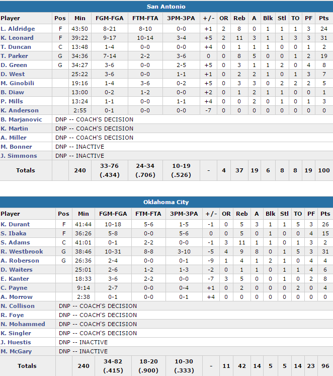 San Antonio a mené la très grande majorité du match, comptant jusqu’à 15 points d’avance, mais OKC a fini par revenir et prendre 4 points d’avance à l’entame du money time. Le trio Kawhi Leonard (31 points à 9/17 dont 3/4 à trois points et 11 rebonds), LaMarcus Aldridge (24 points à 8/21 et 8 rebonds) et Tony Parker (19 points à 7/14 dont 3/6 à trois points, 8 rebonds et 5 passes) a alors pris les choses en main avec l’aide d’une excellente défense pour faire la différence. Les Texans ont shooté à 43.4% mais avec un 10/19 derrière l’arc, qui compense un petit 24/34 sur la ligne des lancers. Ils ont perdu seulement 8 ballons contre 14 à OKC, qui a en plus été limité à 41.5%. Le trio Russell Westbrook (31 points à 10/31, rebonds et 8 passes), Kevin Durant (26 points à 10/18) et Serge Ibaka (15 points à 5/6 à trois points) n’a pas réussi à faire la différence en fin de rencontre avec notamment des ballons perdus clés.