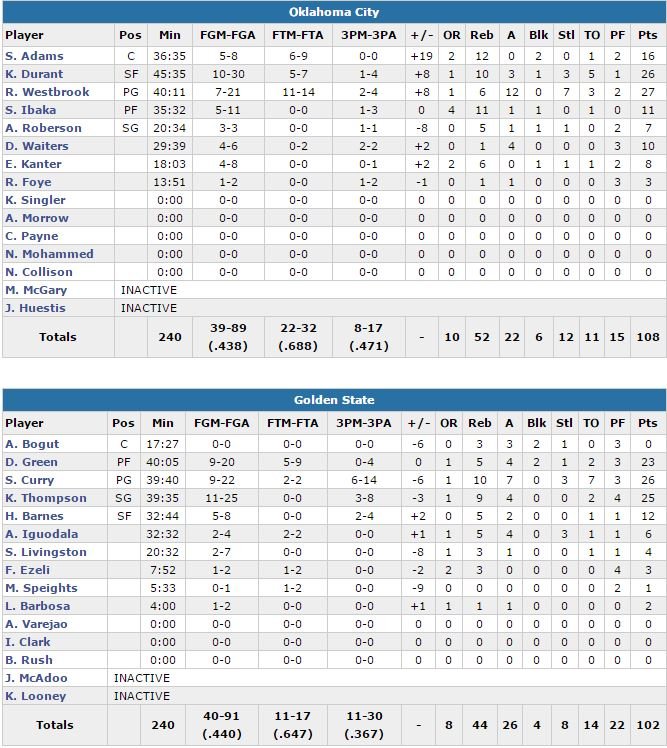 Russell Westbrook et Kevin Durant se sont relayés pour porter l’équipe et terminent respectivement à 27 points à 7/21 (11/14 aux lancers), 6 rebonds, 12 passes et 7 interceptions et 26 points à 10/30, 6 rebonds et 3 passes. La paire, épaulée par 3 joueurs à minimum 10 points, a su être la plus efficace dans les moments clés alors que Stephen Curry (26 points à 9/22 et 6/14 à 3-points, 10 rebonds et 7 passes) restera sur 2 échecs à 3-points dans le money time de ce match 1. Oklahoma City devient au passage la première équipe cette saison à battre Golden State (jusque-là à 37-0) malgré 10 points de retard ou plus à la mi-temps.