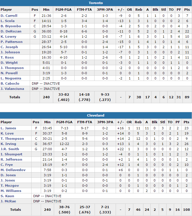 Le Big 3 a une nouvelle fois brillé avec un triple-double pour LeBron James (23 points à 7/13, 11 rebonds et 11 passes mais un 9/17 sur la ligne des lancers), 26 points à 12/22 pour Kyrie Irving et 19 points à 5/8 pour Kevin Love. Jr Smith (12 points à 4/7), Tristan Thompson (9 points et 12 rebonds) et Channing Frye (10 points) apportent leur pierre à l’édifice. Sur la rencontre ils shootent à 50%, perdent seulement 9 ballons, dominent au rebond (46 à 38) et écrasent les Canadiens à l’intérieur avec 50 points à 28 dans la raquette. Ces derniers ont tenu un peu plus longtemps qu’au Game 1 mais terminent avec seulement 40.2% au tir, menés par un duo Kyle Lowry (10 points à 4/14 et 5 ballons perdus) – DeMar DeRozan (22 points à 8/18), pas au niveau nécessaire, malgré un bon apport des remplaçants Cory Joseph, James Johnson et Terrence Ross, qui marquent 11 points chacun. Dwane Casey a tenté le pari Luis Scola en titularisant l’Argentin mais ce dernier a signé 6 points à 1/5. Ils ont montré une nouvelle fois un un manque de puissance de feu qui semble leur être rédhibitoire sur cette série.