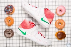 Nike s’est associé à Krispy Kreme pour sortir cette version spéciale des Kyrie 2, les « Ky-rispy Kreme ». Une édition limitée vendue jusque là dans un camion de donuts qui sillonne les USA mais elles sont désormais également disponibles sur NIKEiD.