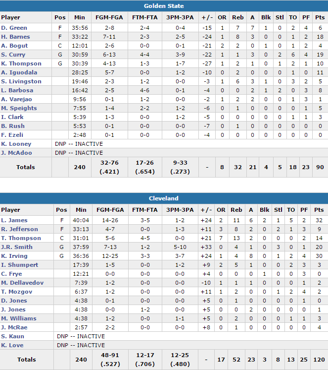 Beaucoup plus agressifs sur le ballon et intenses dès le début de la rencontre, les hommes de Tyronn Lue ont enfin retrouvé leur adresse longue distance (11/24 contre 9/31) en plus d’avoir maîtrisé le rebond (52-32 et 17-8 sur les offensifs). Stephen Curry et Klay Thompson n’ont pas été beaucoup plus en vue que lors des 2 premiers matchs avec respectivement 19 pts à 6/13 et 3 passes et 10 pts à 4/13. Seul Harrison Barnes a su tirer son épingle du jeu avec 18 pts à 7/11, 8 rebonds et 3 passes. Golden State perd également 18 ballons, contre seulement 12 pour Cleveland.