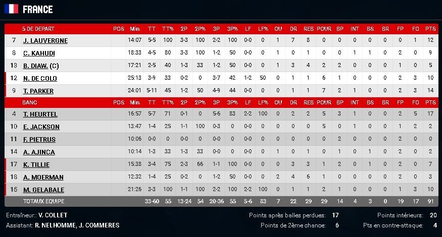 Le festival à trois points s’est poursuivi avec d’entrée deux 3-pts de Thomas Heurtel pour initier un 10-0, 35-20. Grâce à une adresse insolente à l’extérieur, les bleus ont atteint les 20 points d’avance avec à un moment donné un exceptionnel 12/18 à trois points. C’est finalement sur le score de 54-31 que la France est rentrée aux vestiaires. A la pause les bleus affichaient un 13/20 derrière l’arc et 18 passes décisives sur 18 paniers.