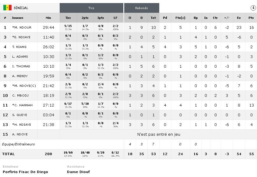 La rencontre a été serrée de bout en bout avec deux équipes d’une très grande maladresse (27.5% pour le Sénégal et 32.3% pour le Canada) et un écart maximum de 7 points. Malgré l’absence de Gorgui Dieng, les lions se sont accrochés toute la rencontre avec une équipe du Canada qui est restée en tête pendant une grande partie du match, mais sans jamais pouvoir faire le break. Menés par les 16 points de Maurice Ndour et les 13 de l’Américain naturalisé Clevin Hannah, ils ont poussé le Canada dans leurs derniers retranchements. Derrière de 5 points à l’entame du dernier acte ils sont restés à distance jusqu’à un 3 points de Maleye N’Doye qui a porté le score à 51-50 à 3 minutes de la fin. Les hommes de Jay Triano ont mieux géré le money time avec des paniers des meneurs NBA Cory Joseph et Tyler Ennis. Ndour a réduit le score à 2 points dans la dernière minute mais le Canada à tenu grâce à des lancers et le dernier shoot pour égaliser d’Hannah n’a pas trouvé la cible.