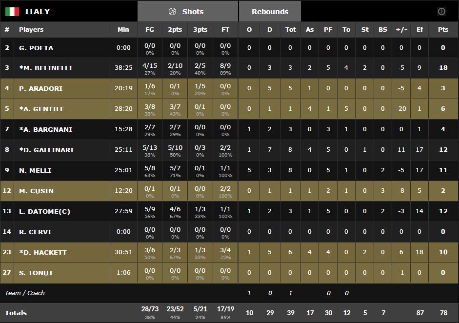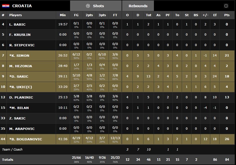 La Croatie mène 19-12 après 10 minutes de jeu puis 22-12 sur 2 lancers-francs de Darko Planinic (13 pts à 5/8, 5 rebonds) en début de 2ème quart-temps. Marco Belinelli (18 pts à 4/15, 3 rebonds et 2 passes) et Danilo Gallinari (12 pts à 5/13, 8 rebonds et 4 passes) tentent de s’allier pour faire face aux assauts répétés de Bojan Bogdanovic (26 pts à 6/19 mais 12/13 aux lancers-francs et 6 rebonds) mais rien n’y fait, le Net est on fire. À la mi-temps, le shooteur en est déjà à 17 points alors que Dario Saric (18 pts à 5/10 et 13 rebonds, élu MVP du tournoi) en est lui déjà à 5 points, 10 rebonds et 2 passes. L’équipe visiteuse est devant 39-34 à la pause.