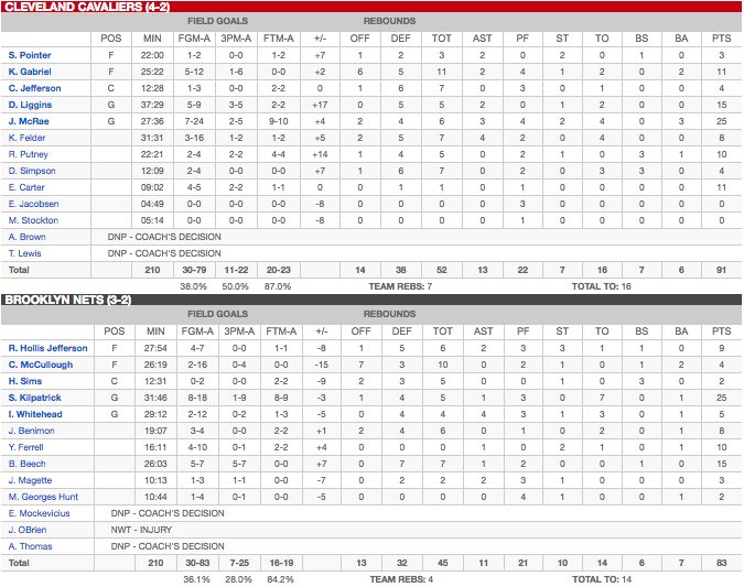 Cleveland Cavaliers – Brooklyn Nets : 91-83 (après prolongation)