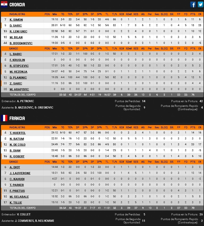 Les Croates ont très vite refait le break avec un 7-0 consécutif à une faute antisportive pour mener 65-50. En difficulté offensivement pour trouver de bonnes positions et en manque d’agressivité, l’équipe de France a inscrit seulement 4 points en 5’30. Sur une bonne série grâce à De Colo ou encore un petit shoot à mi-distance de Rudy Gobert, les hommes de Vincent Collet sont repassés sous les 10 points, 71-63 avec 2 minutes à jouer. Sur un trois points Heurtel a même mis les bleus à 7 unités mais les Croates ont répondu sur l’action suivante par Rok Stipčević , pliant définitivement la rencontre.