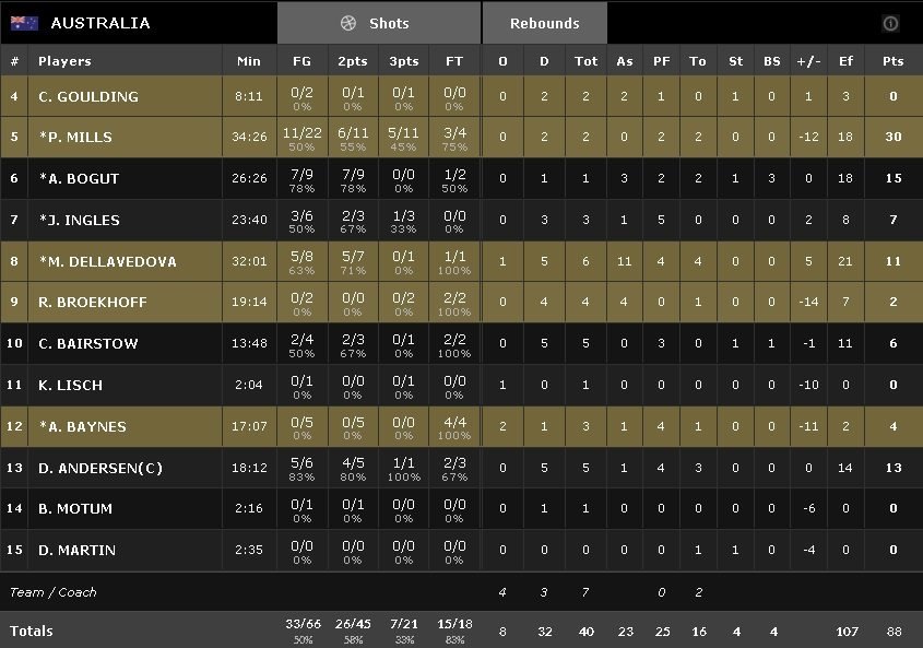 Côté Australien Andrew Bogut (15 points à 7/9, 3 passes et 3 contres) et Patty Mills (30 points à 11/22 dont 5/12 à 3 pts) ont été énormes, mais Matthew Dellavedova (11 points et 1 passes), Joe Ingles et David Andersen (13 points à 5/6) ne sont pas en reste.