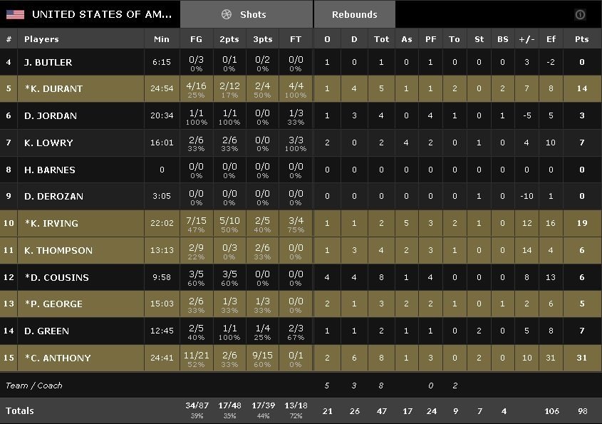 Quel match et quelle opposition proposée par les Boomers à Team USA, qui peut remercier Carmelo Anthony et Kyrie Irving (qui aurait pu jouer avec l’Australie). Accrochés pendant 35 minutes et seulement à plus 4 avec 2 minutes à jouer, les Américains s’en sont remis à Melo et Irving, énormes, pour s’imposer 98-88 (l’écart a gonflé en fin de match au jeu des lancers). Le premier signe 31 points à 11/21 dont un 9/15 derrière l’arc et 8 rebonds alors que le meneur des Cavs marque 17 points à 7/15 en plus de 6 passes.
