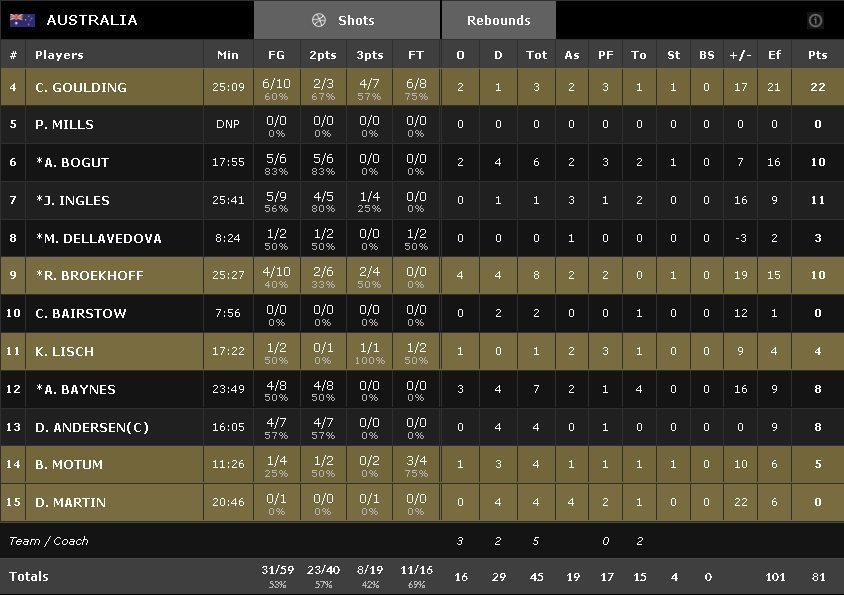 Tout comme lors du match précédent ils en ont profité pour faire tourner leur effectif avec cette fois Patty Mills mis au repos et un temps de jeu maximum de 26 minutes. C’est Chris Goulding qui en a profité pour se montrer en réalisant un gros match avec 22 points à 6/10 dont 4/7 derrière l’arc alors que Joe Ingles en ajoute 11, Andrew Bogut et Ryan Broekhoff 10 chacun. Les Boomers ont effectué une nouvelle prestation solide offensivement avec 53% au tir dont un 8/19 derrière larc alors que dans le même temps ils ont limité les Vénézuéliens à 35%.