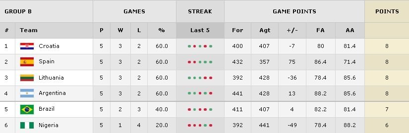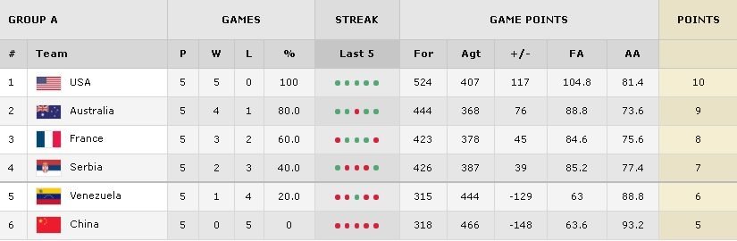 Voilà la première phase du tournoi olympique est terminée et on connait donc les affiches des quarts de finale. Le groupe B a vu 4 équipes terminer avec le même nombre de victoires mais c’est finalement la Croatie qui termine en tête. Voici le classement des deux groupes