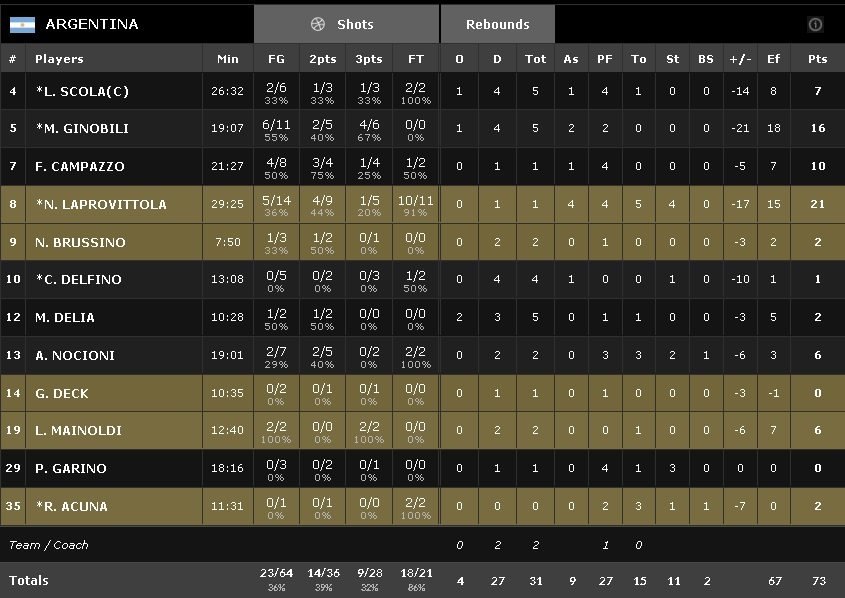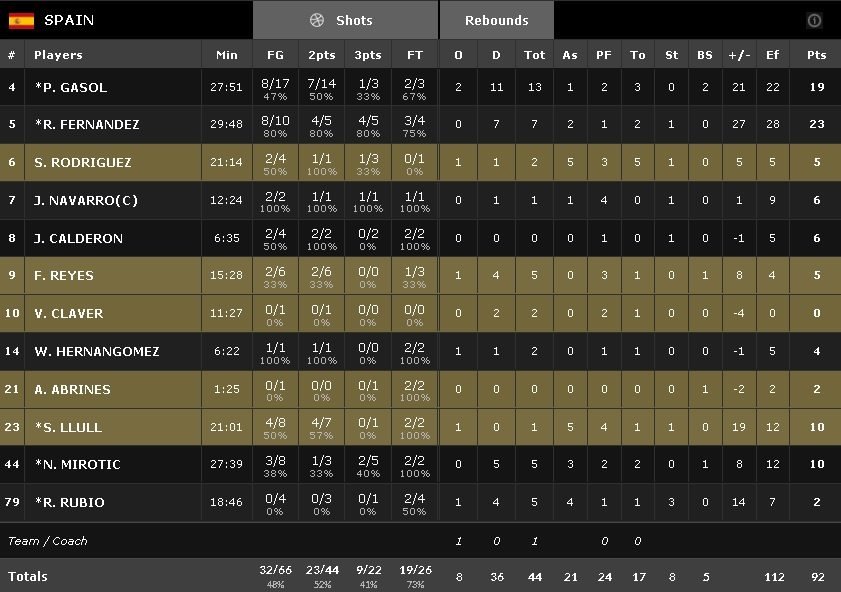 Les Espagnols ont parfaitement géré leur sujet, dominateurs à l’intérieur et bien plus en réussite (9/22 à l’extérieur et 48%)face à une équipe argentine en manque d’inspiration offensive (36% et 17 ballons perdus). Rudy Fernandez signe 23 points à 8/10 et 7 rebonds et Pau Gasol termine avec 19 points à 8/17 et 13 rebonds. Nikola Mirotic et Sergio Llull ajoutent 10 points. En face Nicolás Laprovíttola inscrit 21 points et Manu Ginobili 16. Luis Scola est limité à 7 unités, Andres Nocioni à 6 et Carlos Delfino à 1.