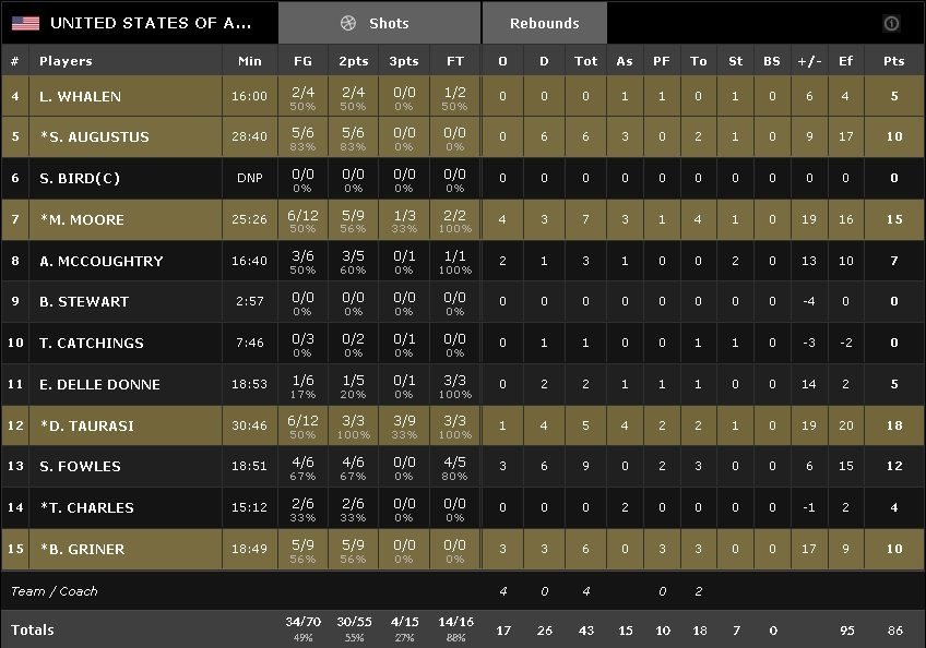 Valérie Garnier a remis son premier 5 sur le terrain et à la faveur d’un 8-0 suite à 3 ballons volées, les braqueuses sont repassées sous les 20 points d’écart, 54-69. Après avoir encaissé un 7-0, elles ont continué de se battre et ont répondu par un 13-2, 67-78. Finalement c’est de 19 points que Team USA l’emporte.