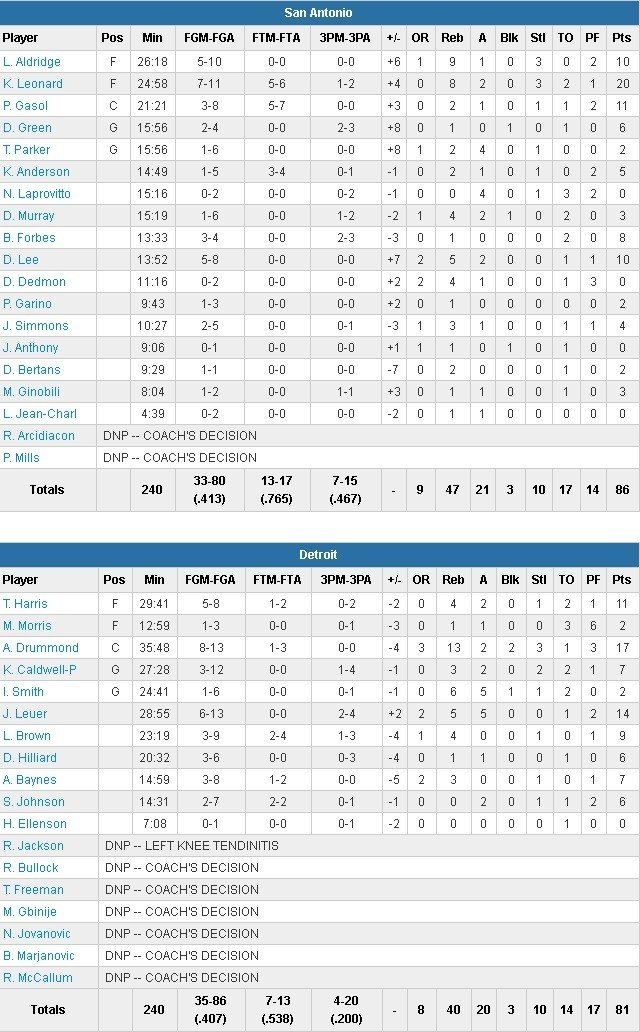 Les Spurs ont dominé les Pistons avec 20 points et 8 rebonds de Kawhi Leonard. Tony Parker signe 2 points à 1/6 et 4 passes. Livio Jean-Charles a joué seulement 5 minutes pour 1 point et 1 rebond.