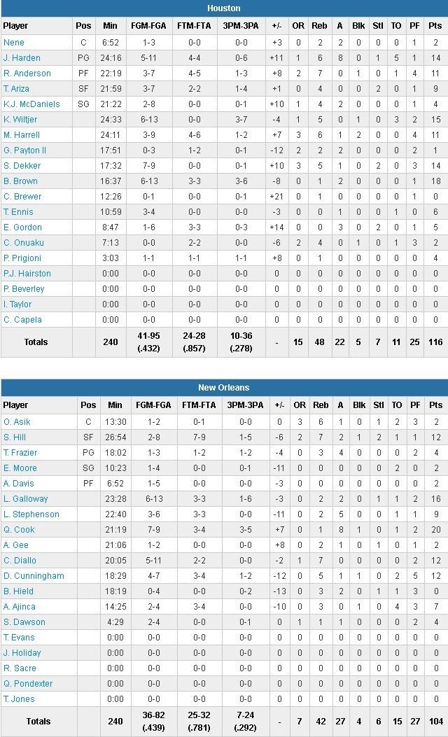 James Harden termine avec 14 points à 5/11, 6 rebonds, 8 passes et 5 ballons perdus en 4 minutes. Boby Brown est le meilleur marqueur avec 18 points tandis que Kyle Wiltjer en inscrit 15 et Sam Dekker 14. Côté Pelicans, Quinn Cook signe 20 points et Langston Galloway 18. Alexis Ajinça compile 7 points à 2/4, 3 rebonds et 4 ballons perdus en 14 minutes.