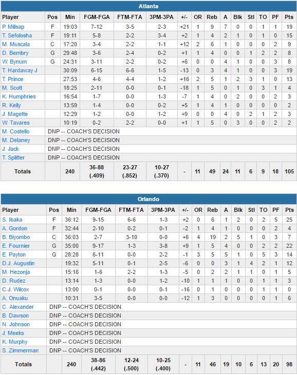 Enfin Paul Millsap (19 points à 7/12, 9 rebonds et 7 passes) n’est pas passé si loin du triple-double dans la victoire d’Atlanta sur Orlando, malgré un bon duo Evan Fournier (22 points à 9/17, 5 rebonds et 4 passes)/Serge Ibaka (25 points à 9/15, 6 rebonds et 2 contres) pour le Magic, dominé sur chaque quart-temps excepté le premier.