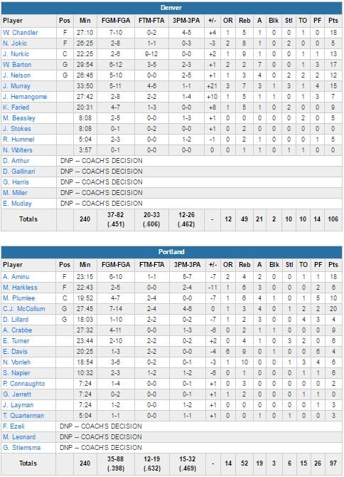 Au Moda Center de Portland les Nuggets se sont imposés notamment grâce à leur belle réaction dans le deuxième quart-temps après un début de match difficile. Damian Lillard n’a pas su mettre dedans hier (1/10) et les 20 points de C.J. McCollum combiné aux 18 points d’Al-Farouq Aminu n’ont pas été suffisants face au trio Jamal Murray (15 points, 7 rebonds, 3 passes), Will Barton (17 points, 7 passes) et Wilson Chandler (18 points).