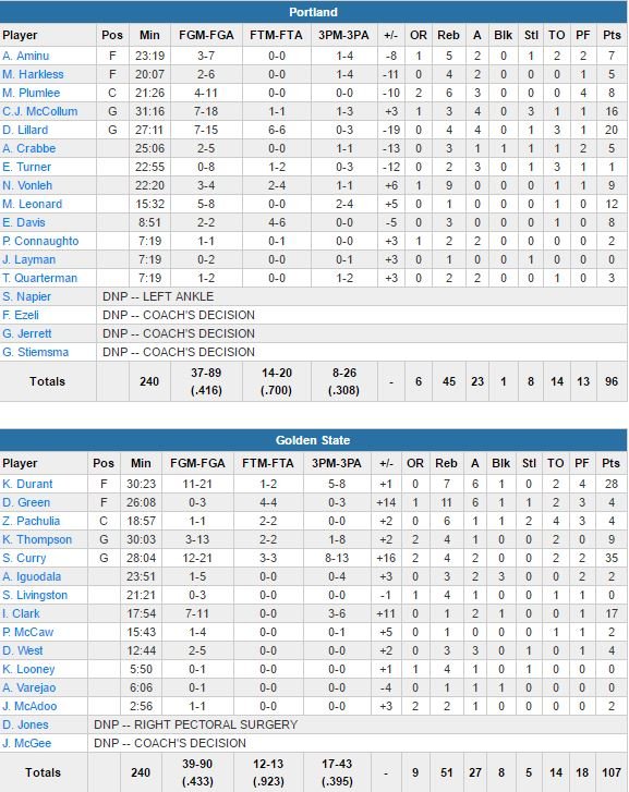 On commence avec une grosse perf’ du duo Stephen Curry – Kevin Durant dans la victoire des Warriors (pourtant menés 22-6 en milieu de 1er quart-temps) sur Portland à l’Oracle Arena. Aucun des deux n’a dépassé les 30 minutes de jeu mais cela n’a pas empêché le meneur de planter 35 points à 8/13 à 3-points et au nouveau venu d’ajouter 28 points à 5/8 à 3-points, 7 rebonds et 6 passes.