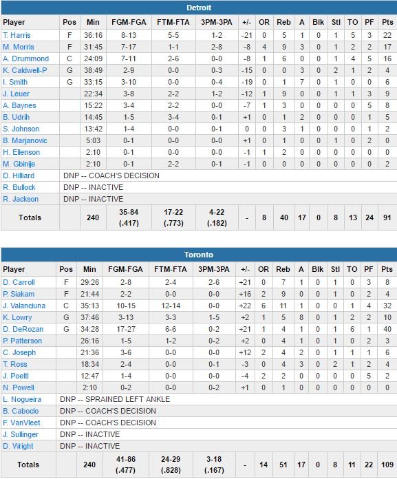Detroit va rapidement prendre 7 points d’avance dans ce match après 2 minutes de jeu mais les locaux passent devant sur un shoot de DeRozan à 6’47 dans le premier quart-temps et ne seront plus jamais rejoints. Lui et Valanciunas vont provoquer faute sur faute dans la période et combinent pour un 13/13 sur la ligne pour respectivement 15 et 10 points et un avantage 33-23 après 12 minutes de jeu. Les Pistons se reprennent face aux remplaçants adverses en début de deuxième quart mais le retour du Lituanien pour 11 nouveaux points va enfoncer le clou à la pause, 58-46. DeRozan s’occupe de poursuivre le travail entamé dans le troisième quart avec 21 points qui permettent aux Raptors de prendre le large 86-71.