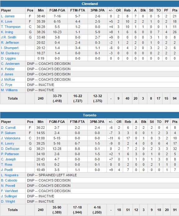 Kyrie Irving et LeBron James ont mené les Cavaliers avec respectivement 26 points à 10/23, 6 rebonds et 6 passes et 21 points à 7/16, 8 rebonds et 7 passes, épaulés par leurs deux intérieurs en double-double Kevin Love (18 points à 6/15 et 10 rebonds) et Tristan Thompson (11 points à 5/5 et 10 rebonds). DeMar DeRozan poursuit de son côté son gros début de saison au scoring avec 32 points à 12/28 et 7 rebonds.