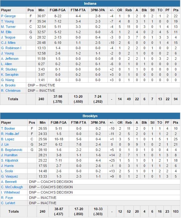 À noter : Thaddeus Young, qu a joué 1 saison et demi à Brooklyn (et à qui le GM des Nets Sean Marks avait assuré qu’il ne serait pas transféré), a signé 19 points. Kilpatrick, natif de Yonkers (New York), a inscrit au moins 10 points dans 21 de ses 25 matchs avec les Nets. Indiana a été limité à 37.8% de réussite. Kevin Seraphin a joué ses premières minutes de la saison (1 rebond en 3 minutes).
