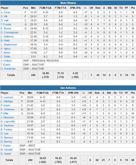 Premier match sans Tim Duncan à domicile en 20 ans et première victoire pour les Spurs (qui jouaient sans Tony Parker et Manu Ginobili, mis au repos en raison d’un back-to-back), vainqueurs de Pelicans fatigués cette nuit, 98-79. Kawhi Leonard a été comme à son habitude très propre avec 20 points à 6/12, 4 rebonds et 3 passes. Les 11 joueurs entrés en jeu pour San Antonio (3 victoires en 3 matchs) ont marqué.