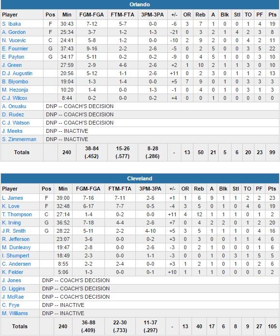 Evan Fournier termine meilleur marqueur de son équipe avec 22 points à 9/16, 2 rebonds et 5 passes. Mené de jusqu’à 22 points, le Magic réussit à revenir à 88-85 à 4 minutes de la fin mais c’est cette fois J.R. Smith (16 points à 5/11 et 5 rebonds) qui prend feu avec trois 3-points et 11 points au total dans le dernier quart. Smith rentre deux 3-poitns consécutifs avant de forcer une violation des 24 secondes de ses adversaires, James suit avec deux paniers à la suite. Serge Ibaka (19 points à 7/12 et 7 rebonds) trouve un and one et rentre son lancer-franc pour revenir à nouveau à trois points (98-95) à 45 secondes, mais le dernier 3-points de Smith repousse l’avantage à 6 points.