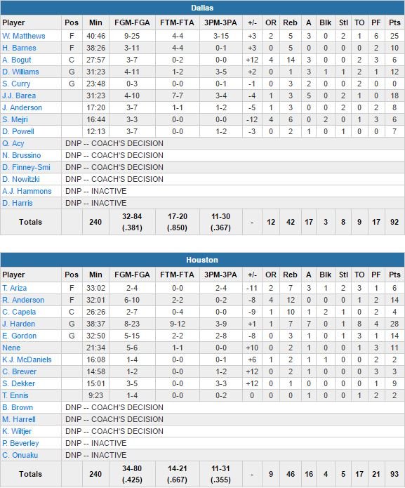À noter : Trevor Ariza et Salah Mejri ont reçu une faute technique après s’être chauffés en fin de troisième quart-temps. Titulaire, Seth Curry a joué 23 minutes pour 0 point à 0/3. Houston a perdu 17 ballons, contre seulement 9 pour Dallas. Les Mavericks ont encaissé 63 points en première mi-temps avant de tenir leurs adversaires à seulement 17 points dans le troisième et 13 points dans le quatrième.