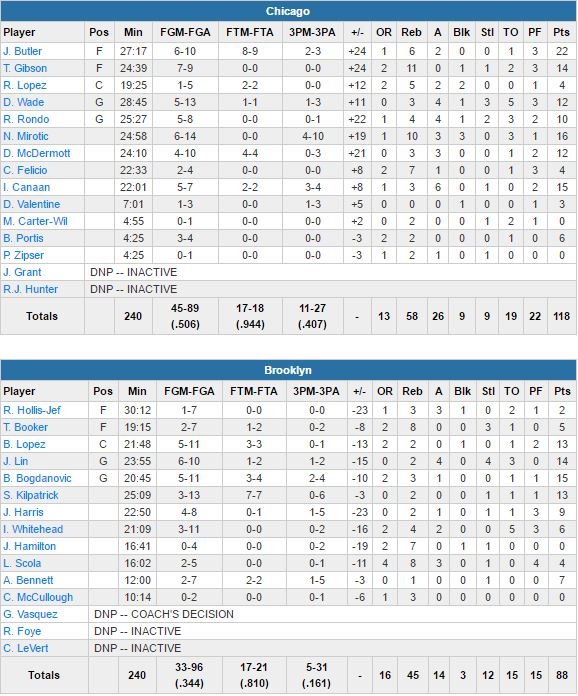 Après avoir battu Boston et Indiana à la maison, les Bulls ont remporté leur premier match joué à l’extérieur cette nuit à New York, et plus précisément au Barclays Center à Brooklyn, 118-88. Une leçon infligée par Jimmy Butler (22 points à 6/10, 6 rebonds), Taj Gibson (14 points à 7/9, 11 rebonds), Nikola Mirotic (16 points, 10 rebonds, 3 passes, 3 contres) ou encore Isaiah Canaan (15 points, 6 passes).
