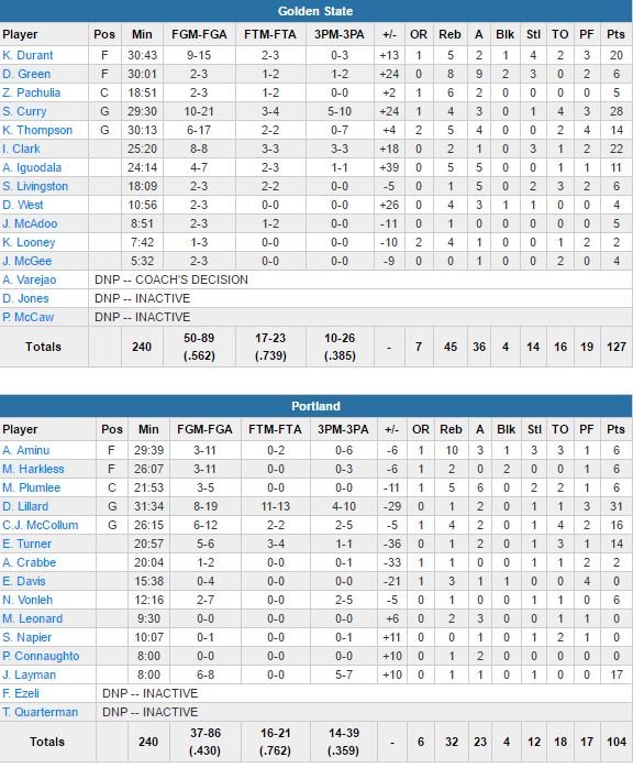 Ian Clark s’est lui illustré en sortie de banc avec un record en carrière de 22 points (dont 16 en première mi-temps). Steve Kerr a pu reposer ses titulaires, qui avaient réussi à prendre jusqu’à 35 points d’avance. Battus en 5 matchs par Golden State lors des derniers playoffs (demi-finales de Conférence Ouest), les Blazers, menés par les 31 points de Damian Lillard (le natif d’Oakland avait inscrit 51 points contre les Warriors dans une victoire 137-105 au mois de février dernier), ont également préféré faire jouer leurs remplaçants à 8 minutes de la fin de la rencontre.