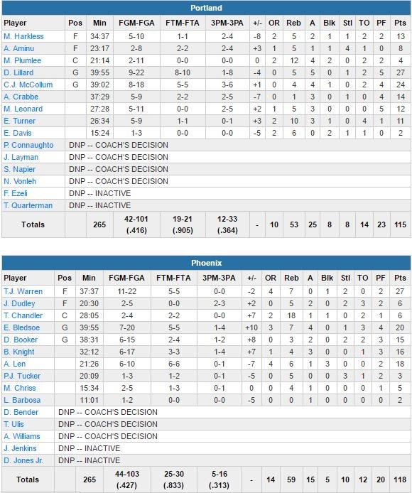 Les Suns (dominateurs 62-38 dans la peinture), qui ont rentré 6 de leurs 10 shoots tentés et leurs deux lancers-francs en prolongation, ont également été aidés par les 27 points de T.J. Warren, les 18 points d’Alex Len et les 18 rebonds de Tyson Chandler. Portland avait pris jusqu’à 6 points de retard durant les 5 minutes de jeu bonus mais Damian Lillard (27 points à 9/22, 5 rebonds et 5 passes) était venu égaliser à 115 partout en obtenant la faute à 6.4 secondes. Son coéquipier C.J. McCollum signe 24 points.