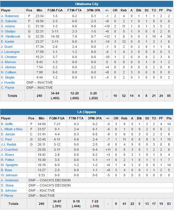 Tous les deux invaincus avant la rencontre, Thunder et Clippers ont eu du mal à se départager cette nuit mais Russell Westbrook a eu le dernier mot avec un shoot réussi à 18.7 secondes de la fin du match qui s’avérera être le shoot de la gagne pour une victoire 85-83 d’Oklahoma City.