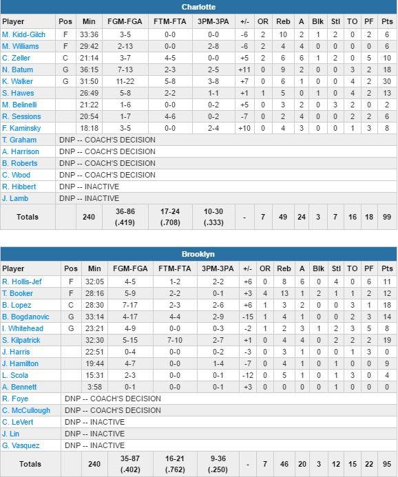 4e victoire en 5 matchs pour les Hornets cette nuit à Brooklyn. Portés par un Kemba Walker (né à New York) signant son meilleur match offensif de la saison (30 points à 11/22, 6 rebonds), Charlotte s’impose 99-95. Nicolas Batum ajoute 18 points à 7/13, 9 rebonds et 2 passes alors que Marvin Williams, qui avait manqué ses 10 premiers shoots du match, rentre un 3-points à 1’05 alors que les Nets étaient parvenus à revenir à un petit point.