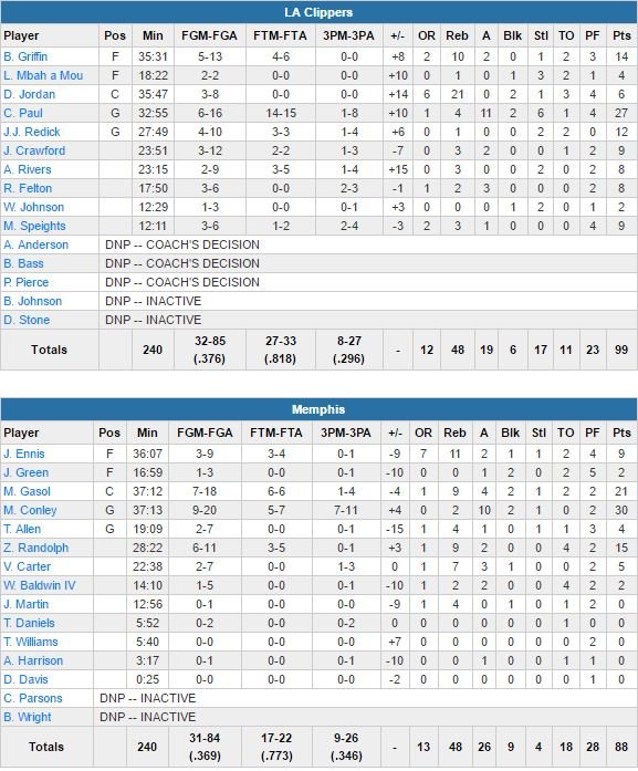 Chris Paul était en mode général avec 27 points à 6/16, 11 passes et 6 interceptions et il a été épaulé par les 14 points et 10 rebonds de Blake Griffin, les 12 points de J.J. Redick et les 21 rebonds de DeAndre Jordan. Los Angeles prendra jusqu’à 21 points d’avance dans le troisième quart-temps avant d’encaisser un 9-0 dans le quatrième. Memphis revient alors à 93-86 à une minute de la fin mais n’ira finalement pas plus loin.